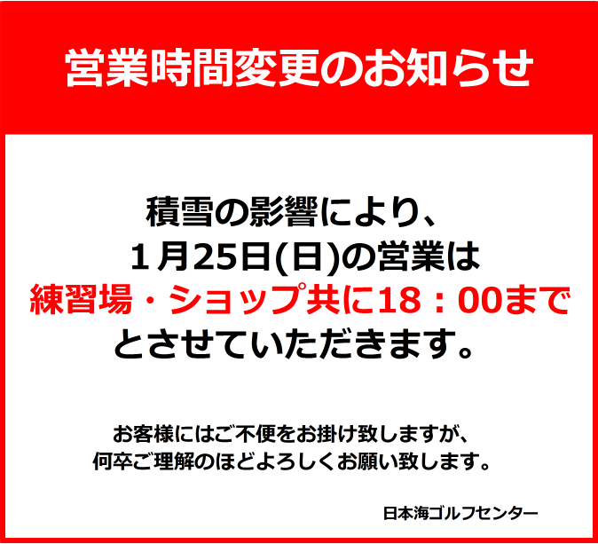 積雪の影響により、1月25日(日)は練習場・ショップともに18:00までの営業とさせていただきます。