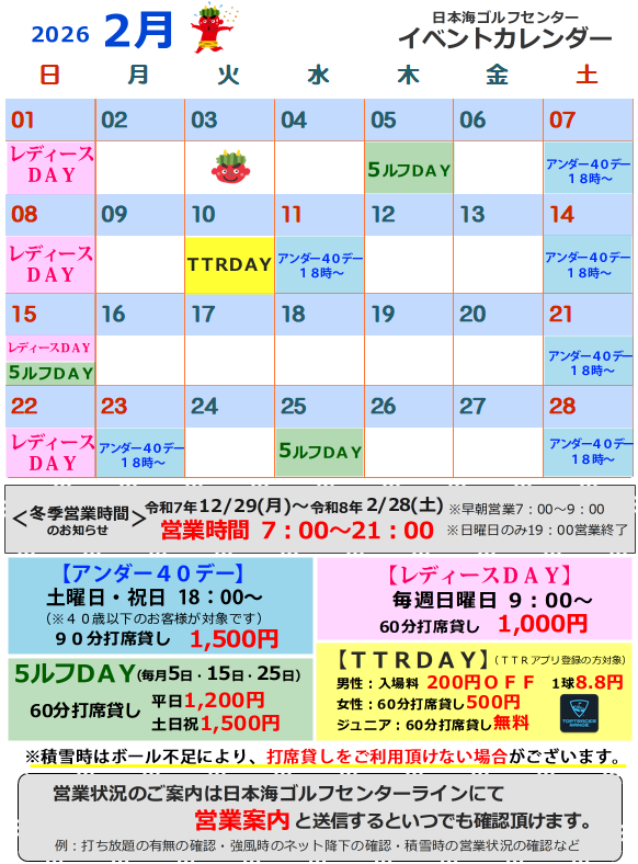 ※積雪の場合はボール不足により、打席貸し(バースデー打席貸し、ジュニア受付、ゴルフデー、レディースデー、アンダー40デー、TTRDAYの女性+ジュニア60分打席貸し)をご利用頂けない場合がございます。ご了承下さいませ。