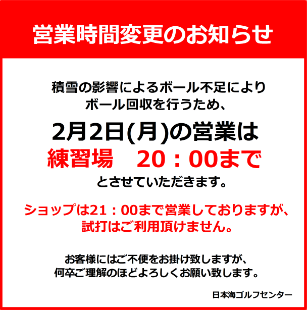 そのため、2月2日(月)の練習場の営業は20:00までとさせて頂きます。