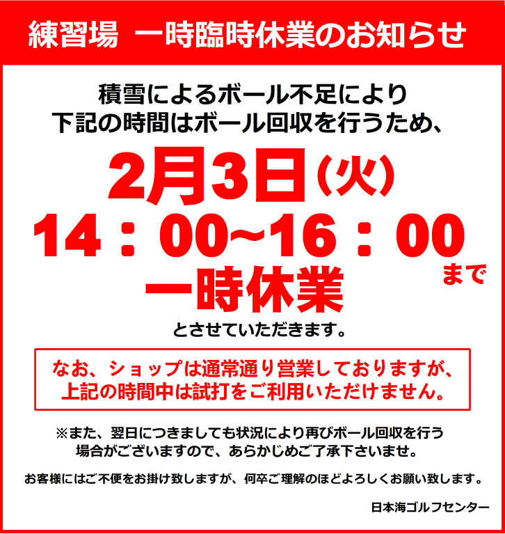 いつも日本海ゴルフセンターをご利用頂き誠にありがとうございます。