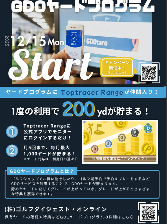 トップトレーサー・レンジ専用アプリを利用(座席モニターの二次元コードをトップトレーサーアプリでスキャン)につき一回で200ydが貯まるように!